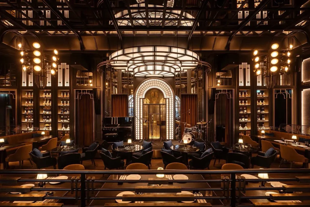The space leans heavily into a Gatsby-inspired aesthetic, including velvet seating, warm tones, and décor that feels like stepping into a vintage theatre from another era.