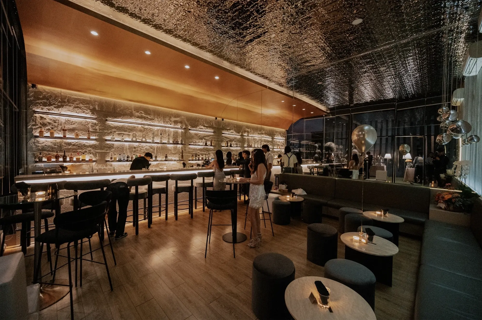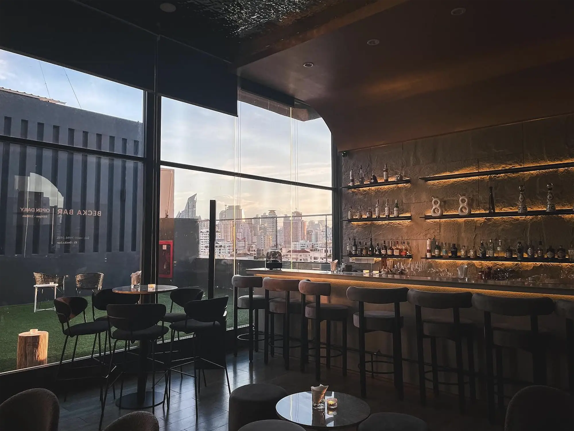 Becka Bar is a rooftop hideaway on the 9th floor of The Residence in Thonglor, Bangkok, blending elegance with a relaxed vibe. Featuring high ceilings, a wall of glass, stone-finished bar counters, and intimate lounge seating, it creates a warm atmosphere perfect for unwinding above the city.