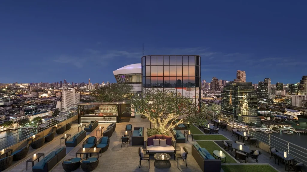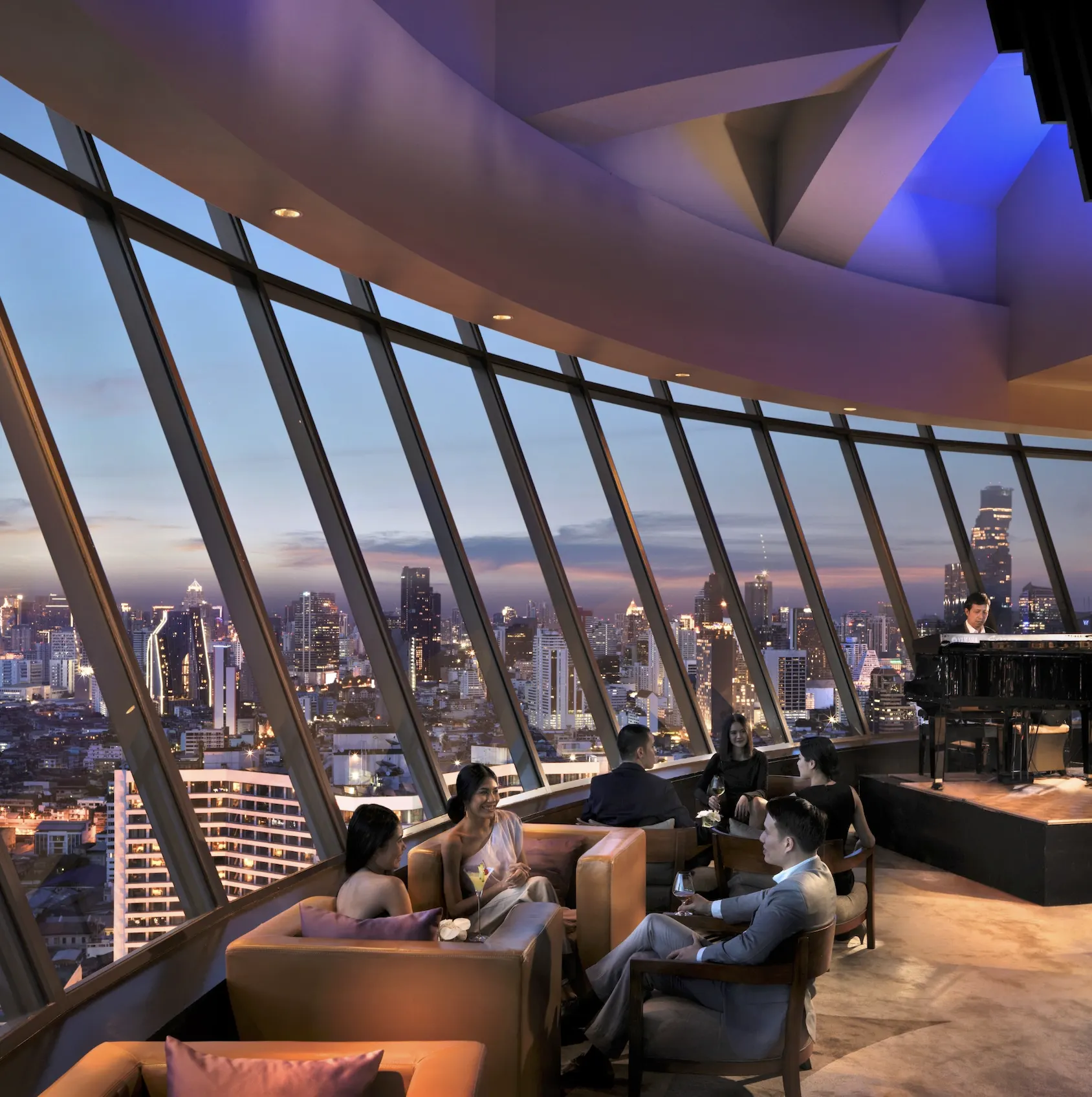 ThreeSixty Lounge offers an elegant escape with sweeping 360-degree views of the Chao Phraya River and the city’s skyline. The venue comprises two distinct spaces: the open-air Rooftop Bar on the 31st floor, ideal for savoring handcrafted cocktails against a backdrop of sunset hues, and the Jazz Lounge on the 32nd floor, where live jazz performances serenade guests in a plush, circular setting with floor-to-ceiling windows. Patrons can indulge in a curated selection of gourmet bites, premium wines, and signature drinks, all while immersed in a sophisticated ambiance that seamlessly blends music, cuisine, and panoramic vistas. Whether for a romantic evening or a refined night out, ThreeSixty Lounge promises an unforgettable experience high above Bangkok.