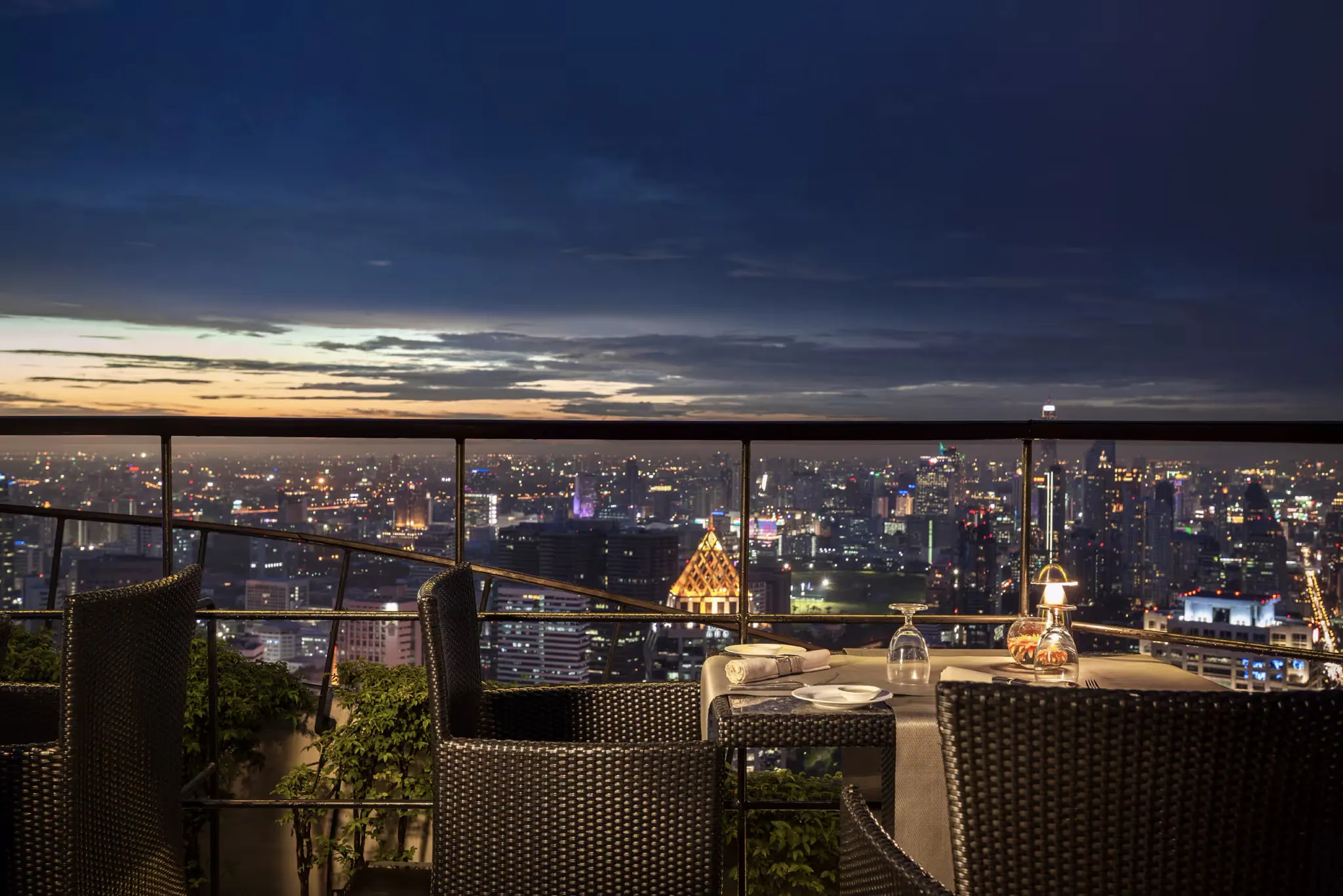 Soaring 61 floors above Bangkok atop the Banyan Tree Hotel, Vertigo offers one of the city’s most breathtaking rooftop experiences. The open-air terrace reveals sweeping 360-degree views of the skyline and the Chao Phraya River, creating a magical atmosphere at sunset. Guests can enjoy premium grilled dishes, fresh seafood, and creative cocktails like the signature Vertigo Sunset, all served in an elegant yet relaxed setting. Whether it’s a romantic night out or a special celebration, Vertigo delivers an unforgettable blend of fine dining, stunning views, and sophisticated city energy.